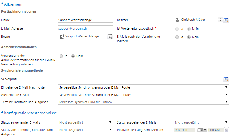 Verfügt man über eine E-Mailadresse ähnlich support@procrm.ch liegt es nahe, dass man die E-Mails direkt im CRM empfangen und abarbeiten möchte. (E-Mailadresse als Shared Inbox zusammen mit dem CRM-Outook-Client funktioniert leider nicht.)