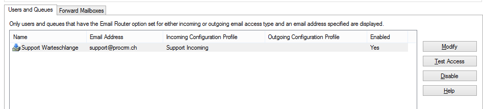| 9. | Bei der Verwendung des E-Mailrouters das Deployment neu laden. Die Warteschlange erscheint unter “Warteschlangen und Benutzer”: Mit dem Klick auf “Test Access” prüfen, ob alle Einstellungen richtig sind. |