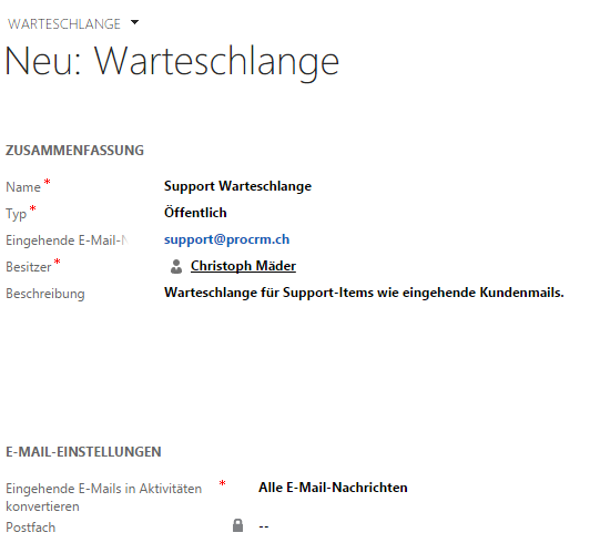 Als nächstes wird im CRM die entsprechende Warteschlange erstellt. Dazu muss wie folgt vorgegangen werden: