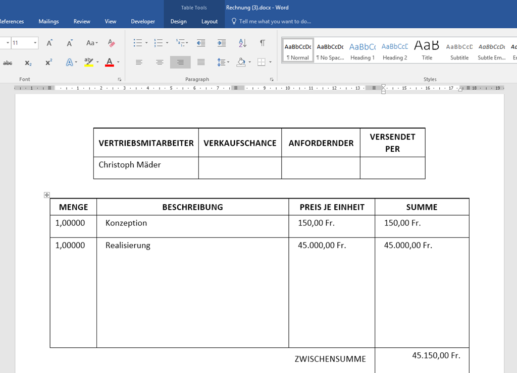 CRM erstellt anhand des gewählten Templates eine Word-Datei, welche alle Daten inkl. Rechnungspositionen zeigt: