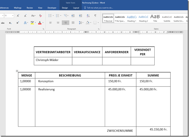 Der Rechnung kann nun im Word nach belieben angepasst werden.